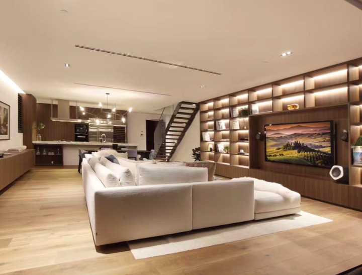 這個案例里面的筒燈和斗膽燈扮演了基礎照明角色,根據(jù)產(chǎn)品產(chǎn)數(shù)使得環(huán)境lux維持在200左右這個較為舒適的值,同時,斗膽燈的設計,以及燈帶和吊燈則作為氛圍照明,使得重點區(qū)域如沙發(fā),餐桌,靠墻的書桌都達到了300 lux這么一個比較明亮的值。并沒有使用射燈作為重點照明,而是在電視機背景墻上大量使用了櫥柜燈,配合右邊的燈帶在照顧整體照明設計的同時提升了立體感。