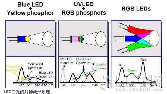 RGB燈的成像原理:RGB燈是以三原色共同交集成像,此外,也有藍(lán)光LED配合黃色熒光粉,以及紫外LED配合RGB熒光粉,整體來(lái)說(shuō),這兩種都有其成像原理,但是衰減問(wèn)題與紫外線對(duì)人體影響,都是短期內(nèi)比較難解決的問(wèn)題,因此雖然都可以達(dá) 到白光的需求,卻有不同的結(jié)果。