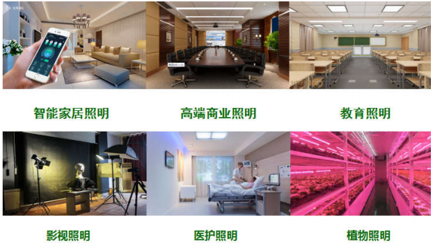 隨著 LED 技術(shù)的進(jìn)步和提升,目前市場上全光譜光源應(yīng)用領(lǐng)域越來越廣,主要應(yīng)用于高端室內(nèi)照明和影視照明以及植物照明等領(lǐng)域。其中高端室內(nèi)照明、影視照明領(lǐng)域?qū)τ诠庹召|(zhì)量要求主要體現(xiàn)在顯色指數(shù)上,通常要求 Ra(R1-R8 的平均值)達(dá)到 95 以上,才能更好的呈現(xiàn)物體真實(shí)本色。舒適的光照品質(zhì),能夠緩解人體視覺疲勞,同時(shí)提高用戶對(duì)應(yīng)用產(chǎn)品的滿意及信賴。全光譜 LED 應(yīng)用場景圖例(如下圖 9):被廣泛應(yīng)用于影視照明,智能家居照明、高端商業(yè)照明、教學(xué)照明、醫(yī)護(hù)照明、植物照明等對(duì)光照質(zhì)量要求較高的場所。