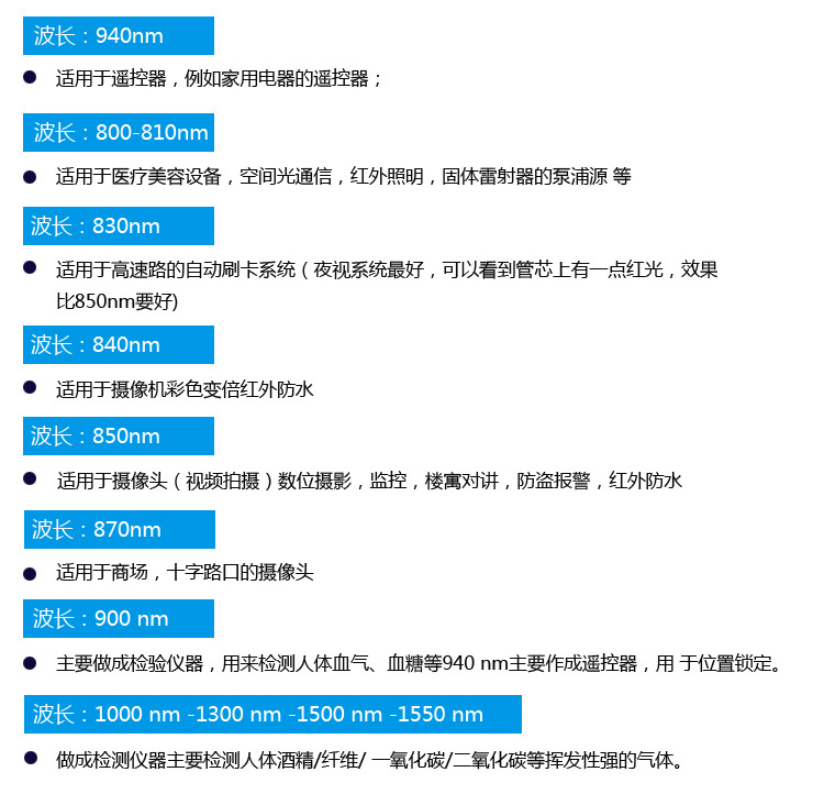 深圳市極光光電有限公司,專業(yè)研發(fā)生產(chǎn)高清紅外LED燈(如850/940紅外發(fā)射燈,超高亮紅,黃,藍,綠,紅黃藍綠白交通信號,貼片0603,0805,3528,2835,50503020大功率紅外LED燈,5050紅外線發(fā)射管。主要用于;游戲機、投幣機、遙控器、各種安防設(shè)備、紅外線像頭、電子儀表,電表,水表,鼠標(biāo),鍵盤,高清網(wǎng)絡(luò)攝像頭,車載后視,紅外車載攝像頭,交通信號燈紅外攝像頭,醫(yī)療保健設(shè)備.紅外相機,無線鼠標(biāo)遙控機,室內(nèi)照明,景觀燈飾,背光源,廣告與標(biāo)志……廣泛應(yīng)用于樓宇對講、安防監(jiān)控、錄音筆、車載DVDV、筆記本電腦、醫(yī)療設(shè)備、手機、電話機、耳機、對講機、收錄機、聲控?zé)艏奥暱赝婢叩取1舅鹃L期供應(yīng)850紅外燈正品,正芯,各角度型號正常供應(yīng)8mm圓頭紅外發(fā)射管型號:IRP8013C2無色膠體(也可做有色膠體IRP8013T2,藍色膠體,IRP8013F2,黑色膠體)波長:940-950nm,840-850nm發(fā)射距離:8-15米,15-20米,30-100米以上工作電壓:940電壓為1.1-1.3V850電壓為1.45-1.55V工作電流:按照芯片大小決定10mil芯片為30毫安12mil為50毫安14mil為80毫安16mil為100毫安40mil芯片為300毫安42mil芯片為800毫安發(fā)射角度:15°、30°、45°、60°90°120°140°度適用于小家電,開關(guān),電動牙刷,玩具,醫(yī)療器械,遙控器和夜間監(jiān)控器(攝像頭)特性:體積小,光度強適合在室內(nèi)外及高溫度與低溫度下工作。